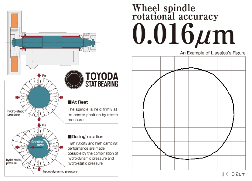 Hybrid TOYODA STAT BEARING are used for the wheel spindle bearings. Metal-to-metal contact will never occur with these highly rigid bearings, which have a high damping effect, make 0.016μm the new definition of wheel spindle rotational accuracy.